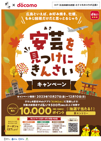 1.期間中KINSAIへの会員登録と、キャンペーンサイトからのエントリーのうえ、対象エリア(広島市・廿日市市・呉/江田島市)のd払い加盟店にてd払い(コード決済)で1回500円(税込)以上お支払いされたお客さまに対して、抽選でdポイント(期間・用途限定)を最大10,000ポイント進呈いたします。