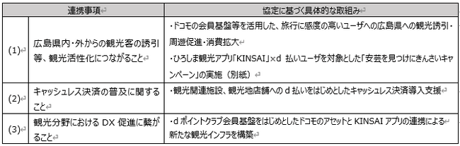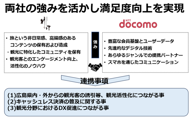 広島県を「何度も訪問してもらえる観光地」にするため、ドコモの会員基盤等の先進技術の活用による新たなビジネスモデルやサービスの創出等に資する取り組みを推進し、県内外へ広島各地の魅力を発信していきます。