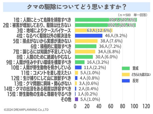 「不必要な殺戮を推奨しているわけではなく、共存する上で必要なことだと思います。熊の駆除について、人間の勝手な行いだとの批判については、ある程度の理解はできるが、人命の方が重い。(20代・男性)」