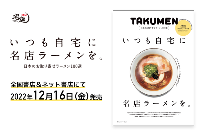 国内最大級のラーメン通販サイト「宅麺.com」(https://www.takumen.com/)を運営するグルメイノベーション株式会社(本社:東京都渋谷区、代表取締役社長:井上 琢磨)は、“宅麺のある生活”を提案する全く新しいライフスタイルムック『いつも自宅に名店ラーメンを。~日本のお取り寄せラーメン100選~』を全国書店&インターネット書店にて2022年12月16日(金)に発売いたします。