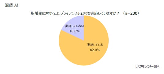 企業担当者200名に対し、取引先に対するコンプライアンスチェックを実施しているかを聞いたところ、「実施している」(回答率82.0%)が8割を超過し、「実施していない」(同18.0%)を大幅に上回りました。(図表A)