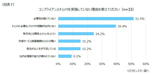 「コンプライアンスチェックを実施していない」企業に対し、その理由を聞いたところ、最も多かったのは「必要性を感じていない」(回答率51.5%)で半数を超える回答となりました。