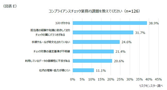 「コンプライアンスチェックを実施している」企業に対して、業務の課題について聞いたところ、「コストがかかる」(回答率38.9%)が最も多く、次いで「担当者の経験や判断に依存しており、チェックの質にバラつきがある」(同31.7%)、「チェックの手順やルールが明文化されていない」(同24.6%)と続きました。