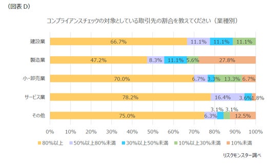 取引先の「80%以上」に対してコンプライアンスチェックしている割合を業種別にみると、最多となったのはサービス業(回答率78.2%)で、最少となったのは製造業(同47.2%)となりました。これは、取引先数が多い業界とみられる製造業の網羅的な実施が難しい状況がうかがえます。一方、製造業同様に取引先数が多いとみられる建設業では、大幅に高い回答率(同66.7%)となっており、業界ごとの取引特性やリスク認識の違いから、各業界の実施率に差が生じていると考えられます。(図表D)