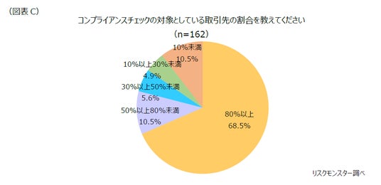「コンプライアンスチェックを実施している」と回答した企業に対して、取引企業の何割をコンプライアンスチェックの対象としているか聞いたところ、「80%以上」(回答率68.5%)が最も多く、次いで「50%以上80%未満」(同10.5%)、「10%未満」(同10.5%)となりました。コンプライアンスチェックを実施している3社に2社が、8割以上の取引先をチェック対象としていることが分かりました。(図表C)