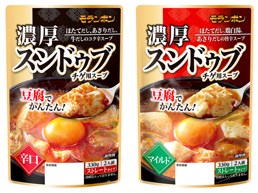 モランボン株式会社(本社:東京都府中市 代表取締役社長:ジョン・ピョンヨリ)では、日配売場向け商品として、「濃厚スンドゥブチゲ用スープ 辛口」「同 マイルド」を9月1日(火)より新発売いたします。