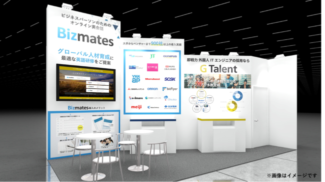 当社のブースでは、企業の英語研修制度としてのビジネス特化型オンライン英会話「Bizmates」のサービスと外国籍ITエンジニアに特化した人材紹介事業「G Talent」のサービスを中心にご紹介いたします。「Bizmates」は、当社が2012年から提供している英会話学習プログラムで、多彩なビジネス経験を持つ一流のトレーナー陣による質の高いレッスンを提供しており、グローバルな環境においてビジネスで成果をあげるための要素を身につけることを目的としています。現在900社を超える企業様にグローバル人材育成のための最適な研修制度として導入いただいております。2018年から提供している「G Talent」では、転職エージェントとして、IT専門のコンサルタントが外国人ITエンジニアの日本での就職・転職をサポートしています。ご来場の際は是非ビズメイツのブースへお立ち寄りください。