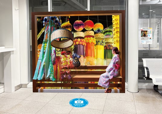 2階改札口周辺の床面・壁面を、祭りの図柄や専用ロゴで構成するアート空間に仕立てます。世
