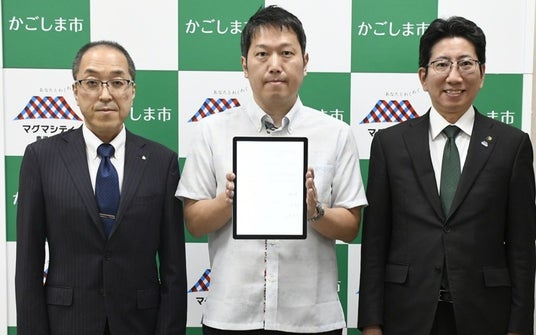 (写真左から鹿児島県商工労働水産部 次長 木村 仁士様、インタラクティブ株式会社 臼井 隆秀、鹿児島市長 下鶴 隆央様)