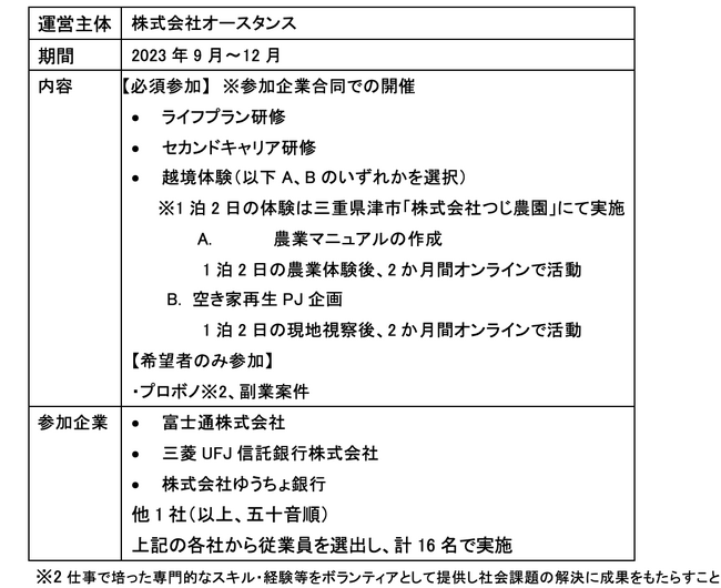 今回の実証実験においては、研修・越境体験ともに各社合同形式で行い、また越境体験の企画も農業体験や空き家再生PJ等、スキル・経験が問われない内容とし、参加ハードルを下げることにより、社外交流の効果を検証します。