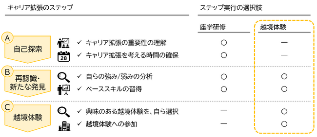 コンソーシアムでは、セカンドキャリアを切り開くまでのステップを4つに分けた上で、まずは社外に目を向け、社外人脈を形成することを狙いとした越境体験から始めることが重要と考えています。
