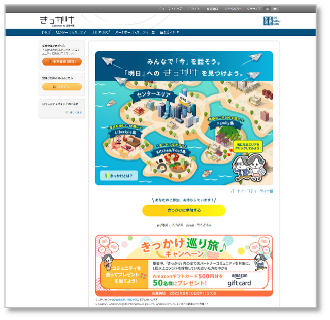 「きっかけ」(https://www.beach.jp/community/KIKKAKE/)は、産経新聞社とクオンが、共同で運営しているオンライン上のコミュニティです。ショッピングモールのようなイメージで発展していくのが特徴の1つで、「きっかけ」は、中心(センター)にある広場のような役目を果たしています。ユーザーはセンターコミュニティである「きっかけ」で、さまざまな会話やキャンペーンを楽しみながら、テナントにあたるクライアントの“パートナーコミュニティ”にも自由に参加、回遊し、コミュニケーションが活性化しています。