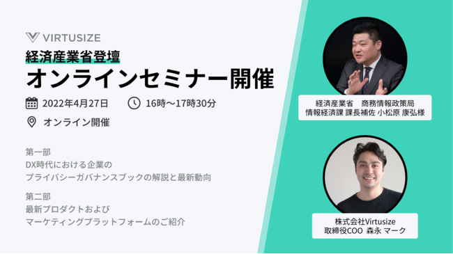 本セミナーの第一部ではまず、経済産業省 商務情報政策局より小松原様をお招きし、「DX時代における企業のプライバシーガバナンスガイドブックの解説と最新動向の紹介」と題し、Society5.0の時代における企業の役割、プライバシーの考え方、企業のプライバシーガバナンスの重要性などについてお話いただくほか、株式会社Vritusize CROの高橋より、サードパーティCookie代替案や個人情報保護法改正法案についても詳しく解説します。