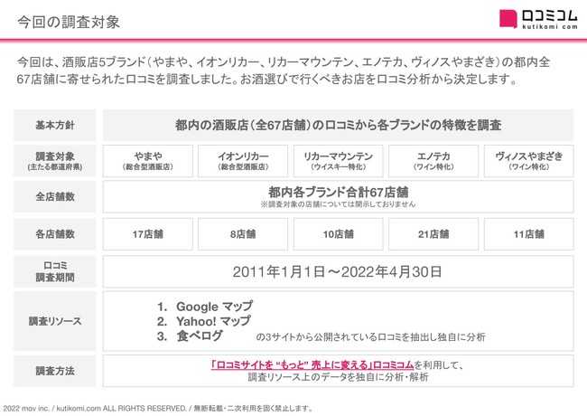 口コミサイトを”もっと”売上に変える『口コミコム』を運営する株式会社mov(代表取締役:渡邊 誠、本社:東京都渋谷区、以下mov)は、『口コミコム』独自のAI分析機能を用い、都内・大手酒販店全67店舗に寄せられた9,000件の口コミを分析してレポートを作成しました。