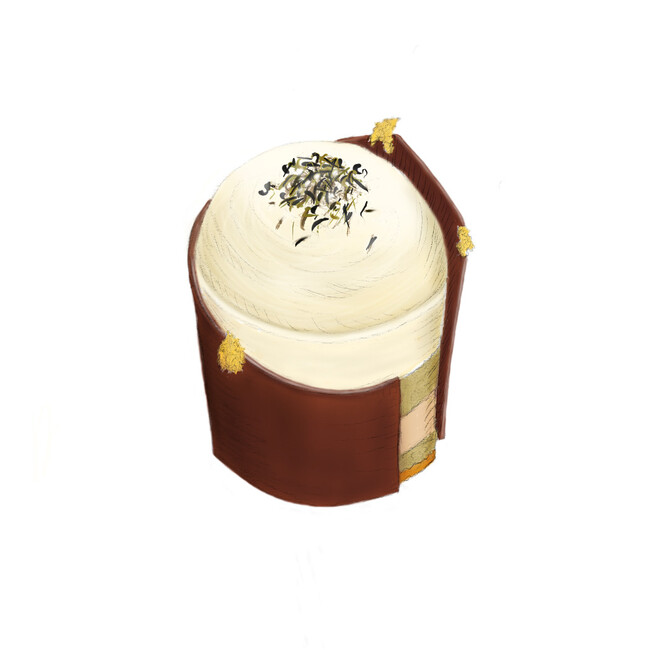 京都老舗宇治茶専門店「小澤清風園」の香ばしいほうじ茶を生地に、地元北山の珈琲店「サーカスコーヒー」とのオリジナルブレントをシロップと中のババロアに使用。味わいに奥行きが加わり上品な仕上がりに。ふんわり白いマスカルポーネクリームをスマートなヴァローナのチョコレートが包み込む装いも美しいティラミスです。