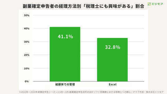 - 経理方法別に「税理士の代行サービスにも興味がある」と回答した割合を見ると、紙媒体で管理している人は41.1%で、Excel・スプレッドシートの32.8%と比べても紙で管理している人ほど頼りたい傾向