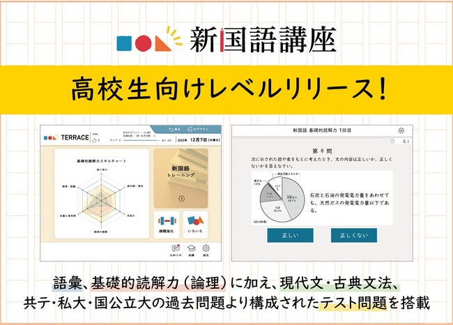 ICT教材の企画開発・販売を行なう株式会社SRJ(本社:東京都中央区、代表:堀川直人、以下「SRJ」)は、2023年7月18日、全国約3,600教室以上の教育機関で導入されている自立学習型能力開発ポータル「TERRACE」の『新国語講座』内に高校生レベルのコンテンツを追加搭載しました。