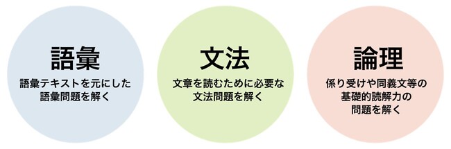 新国語講座では、「読解力育成」に焦点を絞り、「語彙力」・「文法力」・「論理力」をそれぞれ鍛えます。