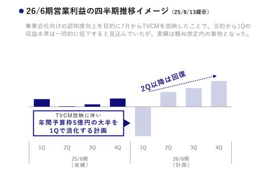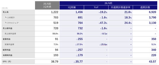 売上高は好調なスキルシェアが牽引し、前年同期比19.2%増の1,456百万円となりました。一方で営業利益は、2025年6月期通期決算発表時にお示しした計画に従い、広告宣伝費を集中的に投下した結果、△255百万円(前年同期91百万円)と減益での着地となりましたが、会社計画に沿った進捗状況でございます。