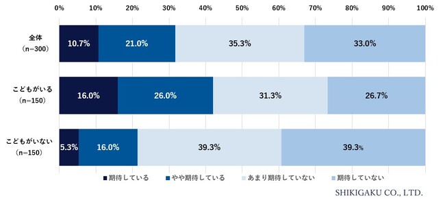 こどもがいる方・いない方別でみると、こどもがいる方は「期待している」42.0%なのに対し、こどもがいない方は21.3%と顕著に差が現れました。このことから「現在こどもがいない方」への施策、啓蒙も重要だと言えるでしょう。