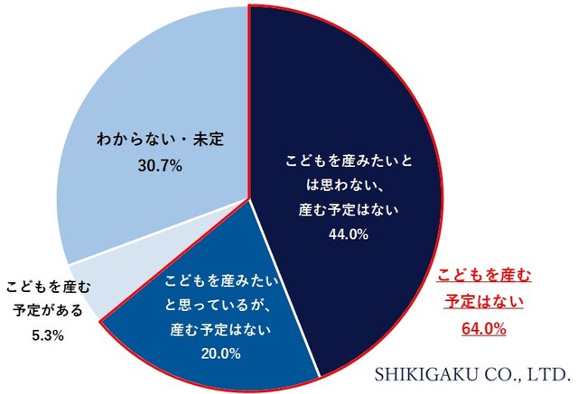 今回の調査で、現在こどもがいない働く女性の6割以上が「こどもを産む予定がない」ことが明らかになりました(「こどもを産みたいとは思わない、産む予定はない」44.0%、「こどもを産みたいと思っているが、産む予定はない」20.0%)。理由のトップは「こどもが欲しいとは思わないため」で、次に「自由がなくなるため」でした。