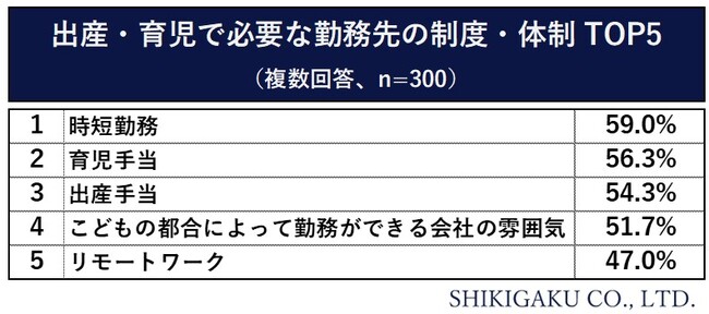では、国ではなく勤務先の対策についてはどうでしょうか。こどもの出産・育児において、必要だと思う勤務先における制度・体制について聞くと、「時短勤務」が59.0%とトップで、「育児手当」56.3%、「出産手当」54.3%、「こどもの都合によって勤務ができる会社の雰囲気」51.7%と続きました。