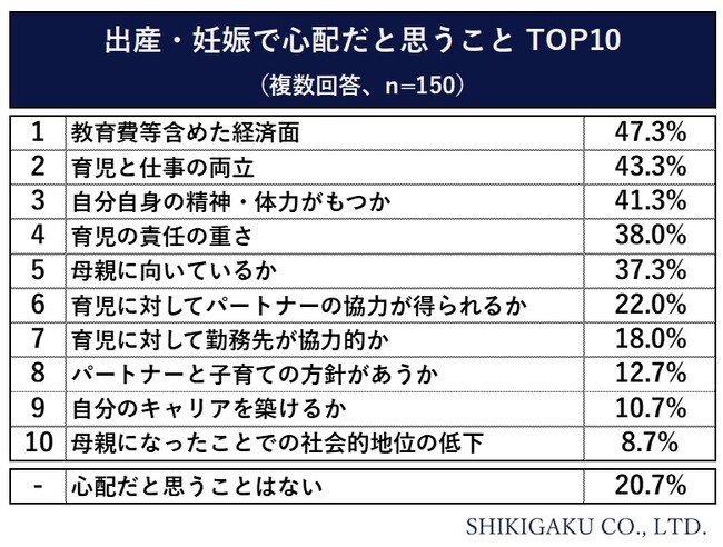 トップは「教育費等含めた経済面」が47.3%で、次に「育児と仕事の両立」43.3%、「自分自身の精神・体力がもつか」41.3%、「育児の責任の重さ」38.0%が上位に挙がりました。