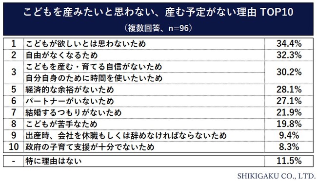 Q1で「こどもを産みたいとは思わない、産む予定はない方」「こどもを産みたいと思っているが、産む予定はない」と回答した方にその理由を聞くと、最も多かったのは「こどもが欲しいとは思わないため」で34.4%でした。次に「自由がなくなるため」32.3%、「こどもを産む・育てる自信がないため」「自分自身のために時間を使いたいため」が同率で30.2%と続きました。“自由”や“自分の時間を大切に”など、こどもを産みたいと思わない理由の上位は経済的なものではなく、ライフスタイルが変化することに対してでした。