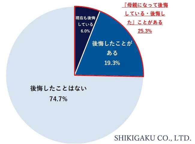 現在、母親になったことの重責や、子育ての辛さから“母親にならなければよかった”という思いを抱え悩んでいる女性がいると話題になっています。そこで「母親になって後悔している・後悔した」ことがあるか聞いたところ、「現在も後悔している」は6.0%、「後悔したことがある」は19.3%で、合計すると25.3%の方が「母親になって後悔している・後悔したことがある」という結果となりました。