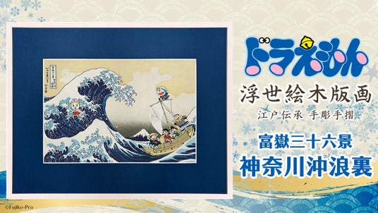これを記念して、10年前にモチーフとして選んだ葛飾北斎の『神奈川沖浪裏』を再び舞台にしてドラえもんたちを描いた【ドラえもん浮世絵木版画「神奈川沖浪裏」】を制作いたしました。2025年4月25日(金)より、公式オンラインショップ「版三 浮世絵工房」にて予約販売を開始いたします。