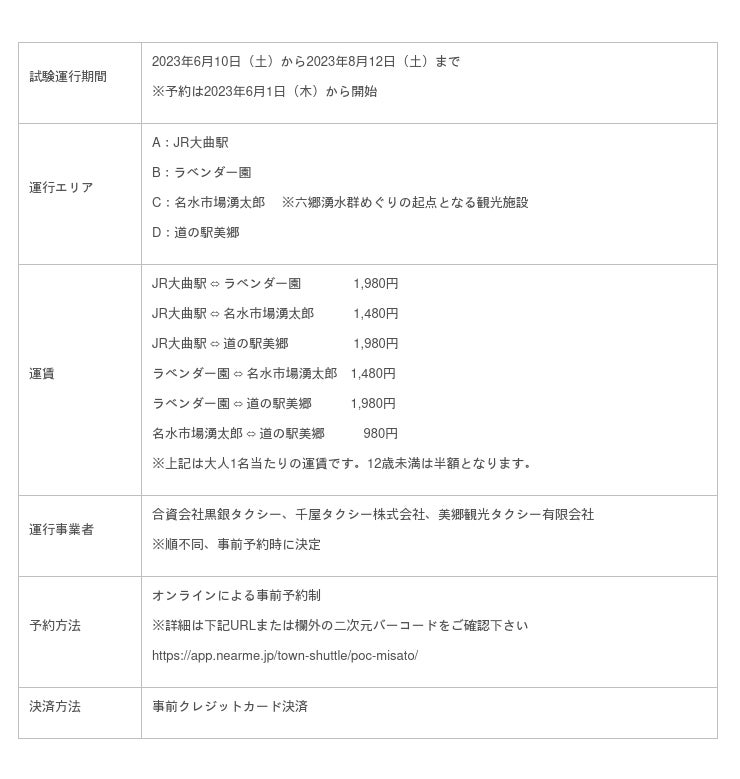 こうした状況を踏まえ、この度、「美郷町への移動をもっと自由に」をコンセプトとして、タクシーを利用者同士がシェアするニアミー独自のAIを活用した観光シェアタクシー「ミズモシャトル」の実証事業を行うこととしました。「ミズモシャトル」は、JR大曲駅を起点とし、ラベンダー園をはじめ、町内の主要観光地・観光施設を繋ぐルートをリーズナブルな価格で訪れることが可能となるほか、Webアプリによるシンプルな予約導線、フレキシブルな予約時間の指定、クレジットカードによる事前決済など、よりスムーズにご利用いただけます。