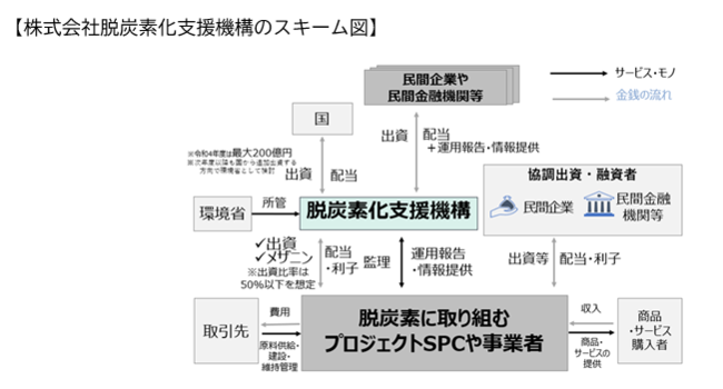 株式会社脱炭素化支援機構は、国の財政投融資(産業投資)と民間からの出資を資本金としてファンド事業を行う株式会社で、資本金を基に、脱炭素に資する事業に対してエクイティ・メザニンなどのリスクマネー供給を行い、巨額の民間ESG資金を脱炭素投資に振り向ける呼び水となることを目指します。