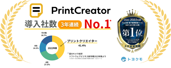トヨクモ株式会社(本社:東京都品川区、代表取締役社長:山本 裕次、以下トヨクモ)が提供するkintoneに連携する帳票サービス「プリントクリエイター」は、株式会社富士キメラ総研(本社:東京都中央区、代表取締役:田中 一志)が発行する「ソフトウェアビジネス新市場2023年版」にて、SaaS型電子帳票の設計・出力ツール導入件数No.1を獲得したことをお知らせします。同項目でNo.1を獲得するのは3年連続※となります。