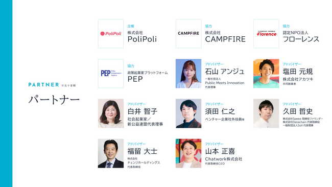 政策共創を実現するプラットフォームの企画・運営をする株式会社PoliPoli(東京都千代田区、以下PoliPoli)は、新たな寄付基金事業「Policy Fund」を開始したことをお知らせします。社会課題解決のため、起業家や投資家などの寄付で基金を設立し、必要とするNPOや「ルールメイカー※」たちによる社会課題解決を支援する新しい仕組みをつくります。
