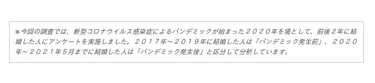 新型コロナウイルス感染症の影響で、2020年以降「結婚にまつわるお金の使い方」は、大きく変化したことが分かりました。この状況がパンデミックの終息後にまた元に戻るのか、このまま結婚するカップルの金銭的な価値観の変化に繋がっていくのかは、まだわかりません。