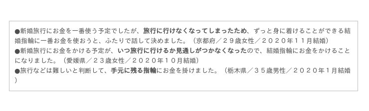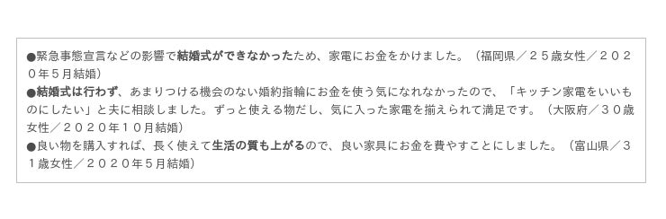 それぞれのコメントから、パンデミックの影響で予定していた消費行動が叶わなかったため、家具・家電や指輪などに多くのお金を費やしたことが分かります。