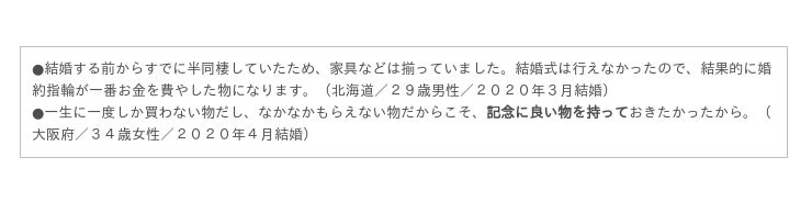 今回の調査から、2019年以前と2020年以降の結婚にまつわる消費傾向は、イベントや行動などの“コト”消費から、長く使用する“モノ”消費へ変化しているといえそうです。