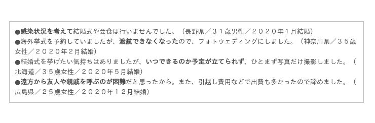 コメントからは、「結婚式はしたいが、できそうにないので諦めた」という声が多くありました。「結婚式」への消費欲求はあったものの、現実的に「結婚式をしない」ことを選択せざるを得ない状況にあることが分かります。