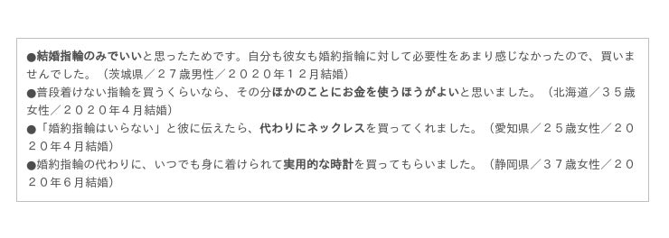 婚約指輪を購入しなかった人の声からは、「必要だと思わなかった」「別のことにお金を使いたかった」という理由が多く見受けられました。婚約指輪の購入欲求がもともとなかった人が買っていないという印象です。