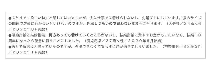 結婚指輪を購入していない人からは、「外出できずに買いに行けなかった」という声が多く聞かれました。