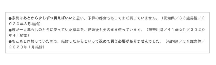 家具・家電に関しては、「同棲していたので必要ない」「一人暮らしだったので揃っていた」というコメントがほとんどでした。