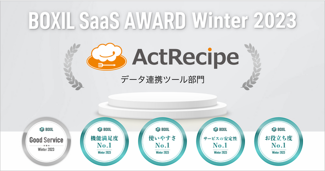 アクトレシピ株式会社(本社:東京都港区、代表取締役CEO:池上大介、以下「アクトレシピ」)が提供するiPaaS「ActRecipe」は、スマートキャンプ株式会社(以下「スマートキャンプ」)が主催する「BOXIL SaaS AWARD Winter 2023」のデータ連携ツール部門において「Good Service」「サービスの安定性No.1」「機能満足度No.1」「お役立ち度No.1」「使いやすさNo.1」に選出されたことを発表いたします。