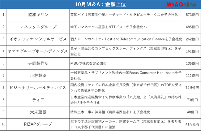 10月の金額首位は協和キリンが573億円を投じて英国のバイオ医薬品企業オーチャード・セラピューティクスを完全子会社化する案件。
