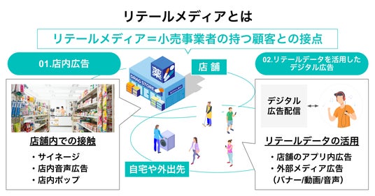 リテールメディアとは、小売事業者が保有する店舗やWebサイト、アプリ、購買データなどを活用し、顧客体験向上や広告配信を行うチャネルのことです。