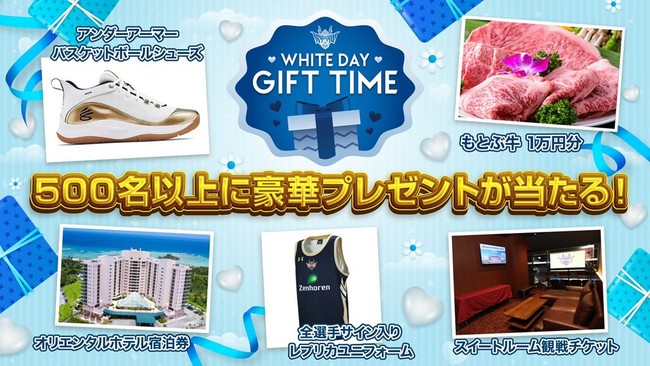 ご来場の皆さまへ日頃の感謝を込めて、500名以上に豪華プレゼントが当たる「WHITE DAY GIFT TIME」をハーフタイムに実施します。お座りの座席番号が抽選番号になりますので、お手元にBスマチケをご用意の上、お楽しみください!