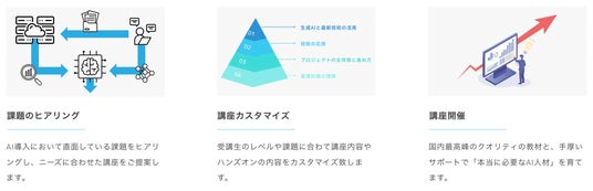企業ごとの課題に最適化された学習を通じて、AI活用の現場で即戦力となる社員育成を目指します。