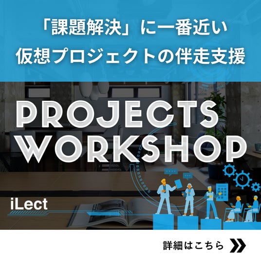 プロジェクトワークショップとは実際の社内課題をテーマに設定し、プロジェクト推進に必要な知識をiLect講座を活用し、プロジェクトに合わせてカスタマイズしたカリキュラムで学びます。