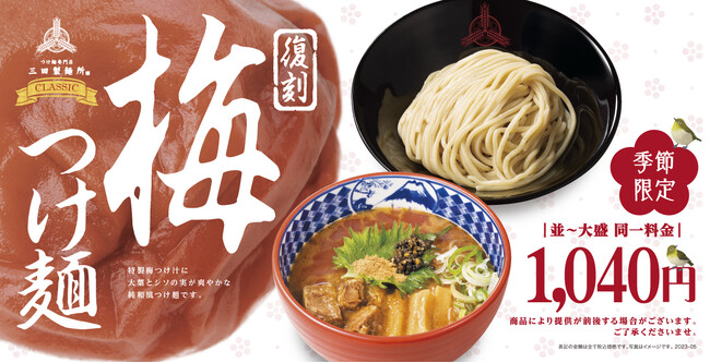 2023年5月16日(火)より、株式会社エムピーキッチン(本社:東京都渋谷区、代表取締役:村上竹彦)が運営する「つけ麺専門店 三田製麺所」は、『梅つけ麺』を2018年以来5年ぶりに復刻販売致します。こってり濃厚な豚骨魚介スープに、梅の爽やかな酸味を凝縮した“梅ダレ”を加え、大葉、しその実も添えた純和風の一杯となっております。過去4年間は取り扱いがございませんでしたが、販売を望む多くのお声を頂き、この度復刻販売をする運びとなりました。