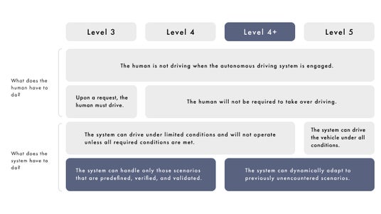 SAEで定義された自動運転レベルに対する「レベル 4+」の概念的な位置づけ