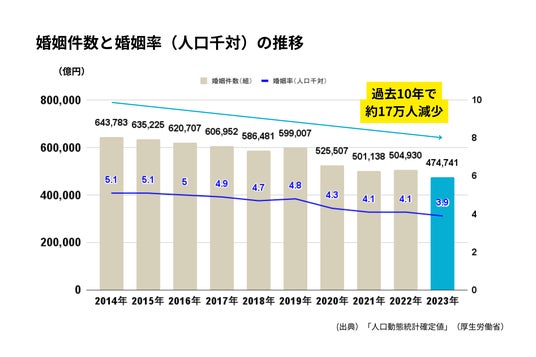2023年の婚姻数は47万組と、10年前(2014年)と比べて約17万組減少しています。同年の人口千人あたりの婚姻率も3.9となり、低下傾向が続いています。(※2)